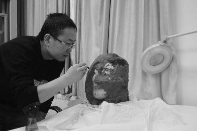 和我們拼圖不同,文物是立體的,大型、復雜的,要分多個局部分別粘接,不但要頭腦中勾畫立體圖,還要講究歸位的次序,考慮后面的部分是否放得進去。前面一個小問題,都會導致最后合拼時茬口對不上。而且,修復師手中的每一個碎片都是惟一的,已粘接上的殘片輕易不能打開重來,那樣很可能對文物造成新的傷害。