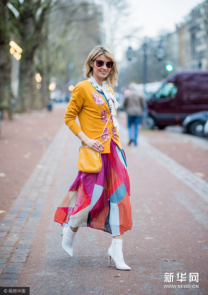 ??? 近日,德國杜塞爾多夫,時尚博主Gitta Banko街拍。她戴Miu Miu茶色墨鏡,身穿Steffen Schraut橘色亮片拼貼針織開衫,內搭Steffen Schraut白色蝴蝶印花系帶雪紡襯衫,Steffen Schraut拼色百褶紗裙,肩背Volker Lang橘色口金包,腳踩Kurt Geiger白色尖頭高跟短靴。