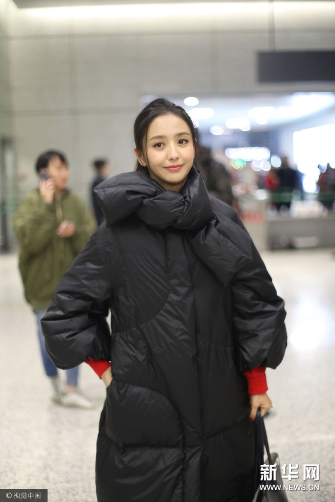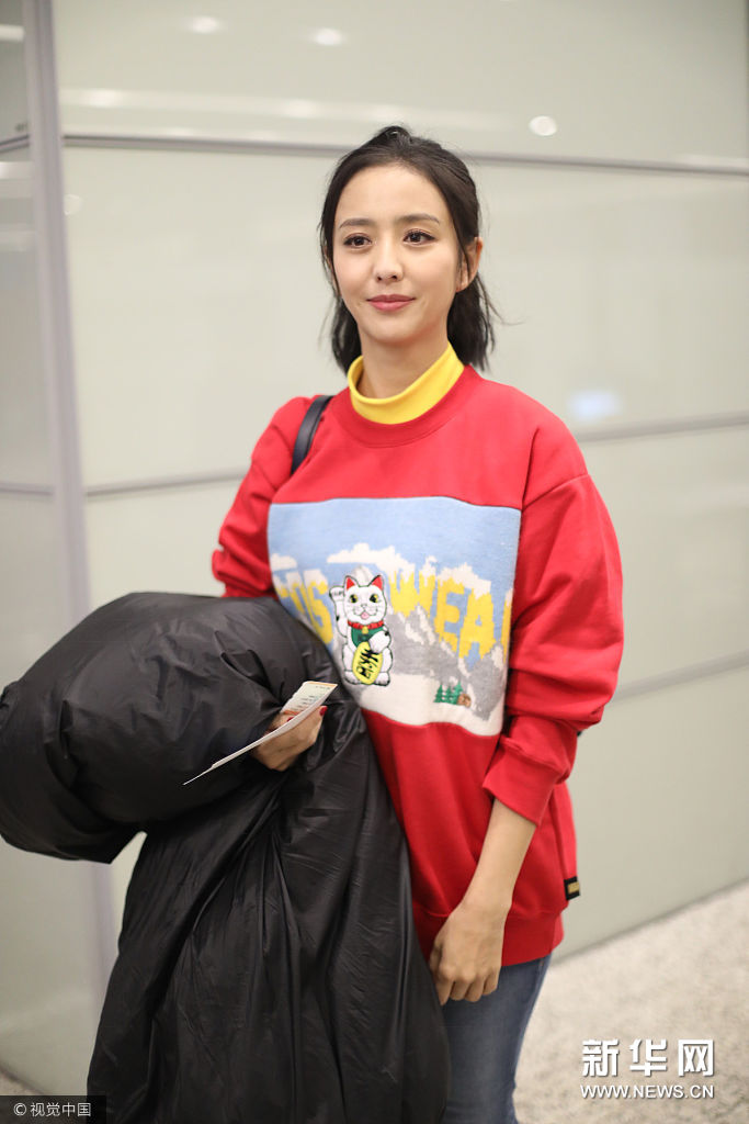 ??? 佟麗婭機(jī)頭梳半丸子頭,身穿GCDS 2017秋冬系列招財(cái)貓雪山風(fēng)景印花紅黃拼色高領(lǐng)衛(wèi)衣,下身穿磨邊緊身牛仔鉛筆褲,腳踩GGDB五角星小白鞋,手拿黑色羽絨服,肩背黑色單肩包。