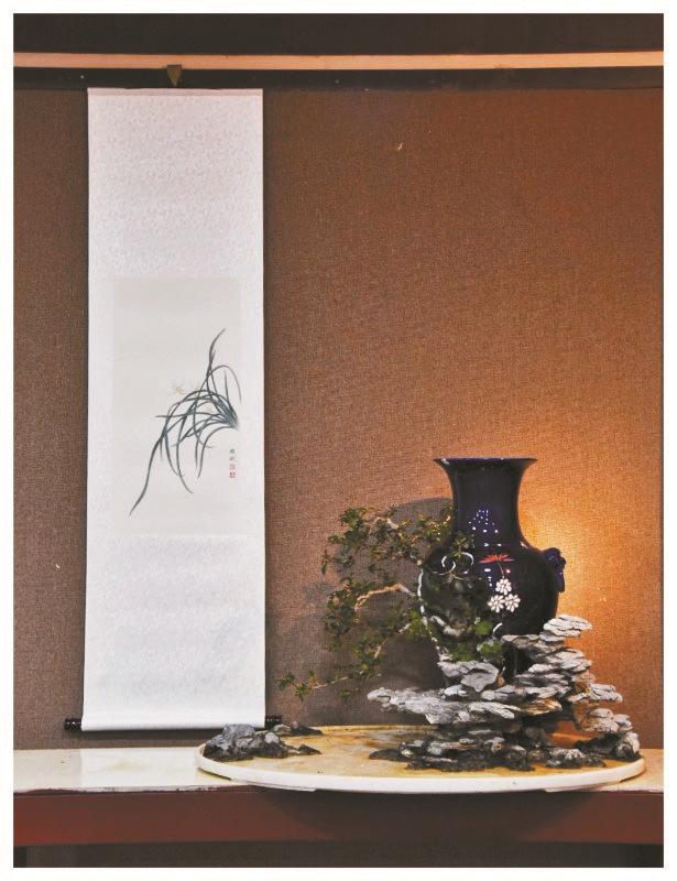 “雙粹”會展特點是景畫交融,典雅清心的工筆國畫,配上美輪美奐的花瓶盆景,賞心悅目,讓觀者流連忘返。
