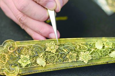 “其實,短短幾天要完全掌握花絲鑲嵌工藝根本就不可能。學(xué)徒需要經(jīng)歷3至5年時間才能學(xué)會。而每期培訓(xùn)班僅能介紹一個很簡單的工藝,如點翠工藝,就是將翠鳥的羽毛巧妙地粘貼在金銀制成的金屬底托上,形成精美的圖案。這些圖案上一般還會鑲嵌珍珠、翡翠、紅珊瑚、瑪瑙等寶玉石,越發(fā)顯得典雅而高貴。但只有親手制作這個小作品,才能真正感受到傳統(tǒng)文化的魅力?!睆埲赕颊f,“我們通過這樣一點點地滲透,將花絲鑲嵌文化慢慢傳承下去?!?/p>