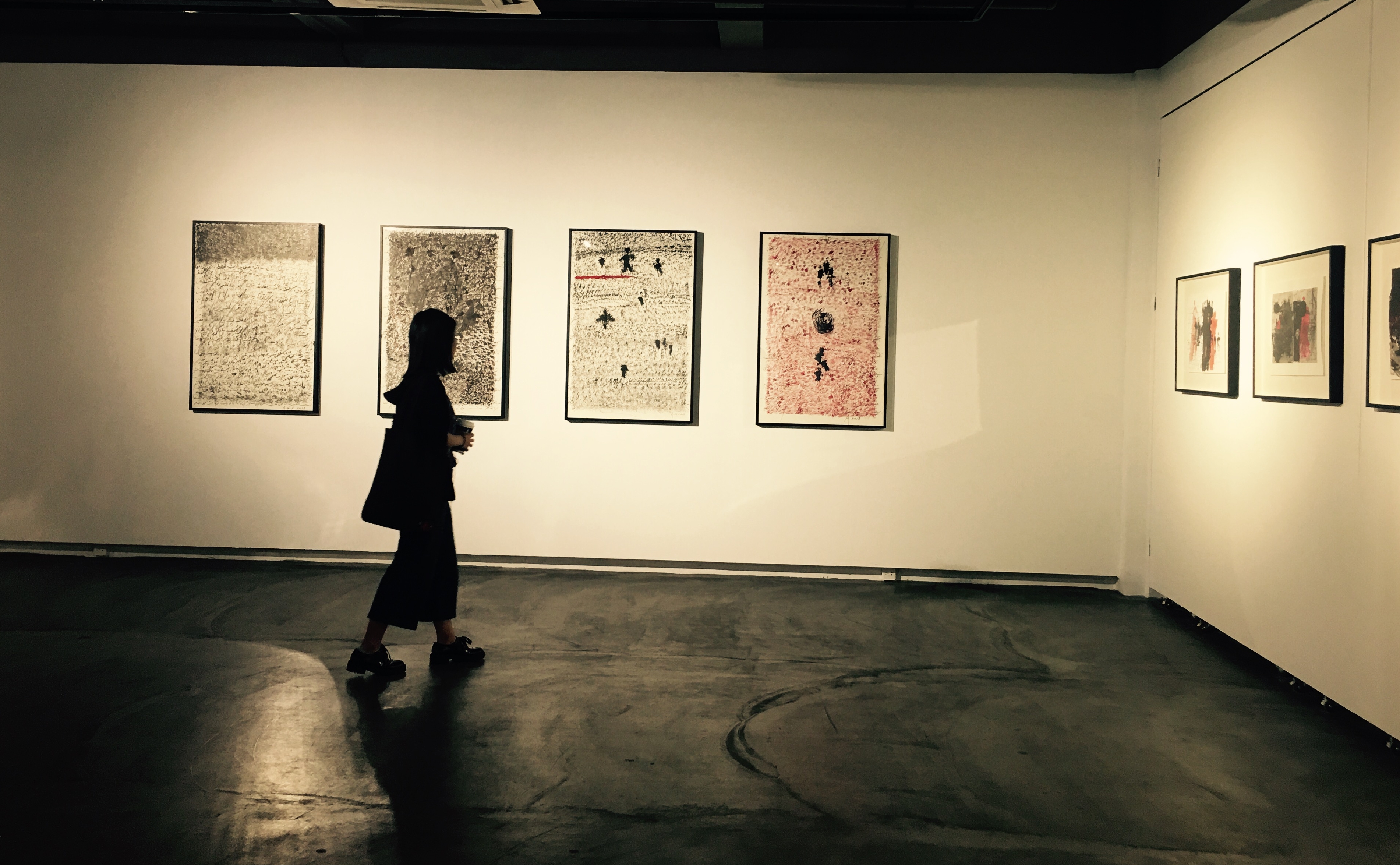 阿多尼斯的畫平靜、深邃,而又暗流涌動(dòng),光芒四射。那些騰躍于拼貼和暈染、抽象和寫意之間的效果,無(wú)論有多么率性隨機(jī)以至近乎游戲,都是那么元?dú)獬渑妫嵵嘛枬M,那么令人既得享酣暢淋漓的解放感,又不由自主地陷入深長(zhǎng)的回味冥思。無(wú)論是怎樣的不拘一格,僅就色彩言,黑與紅及其不同的變奏,可以說構(gòu)成了這些作品的基調(diào)。