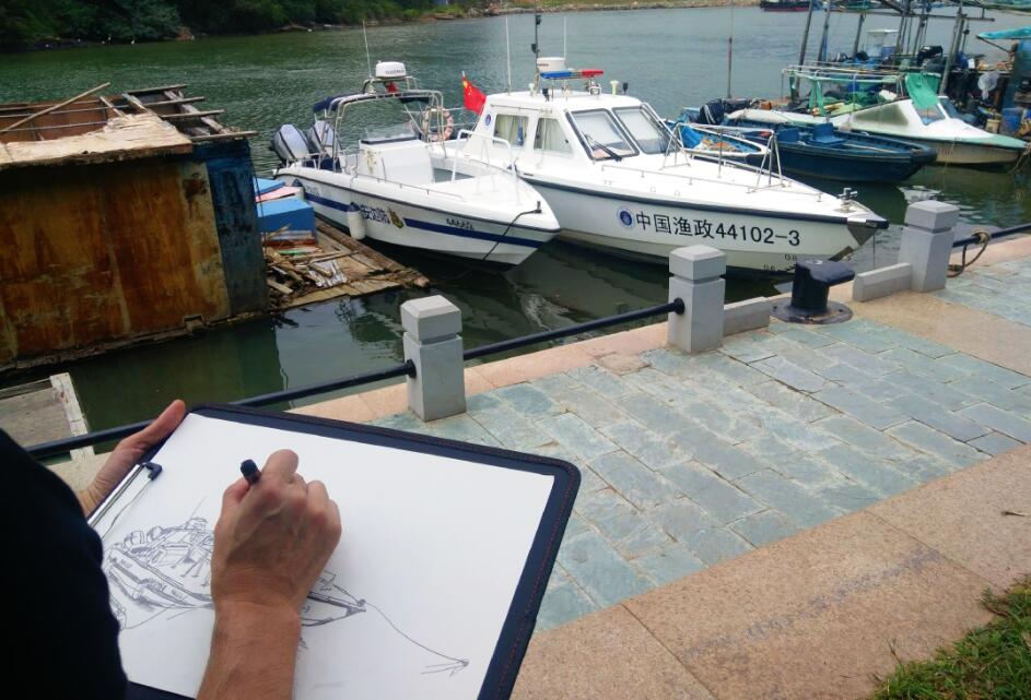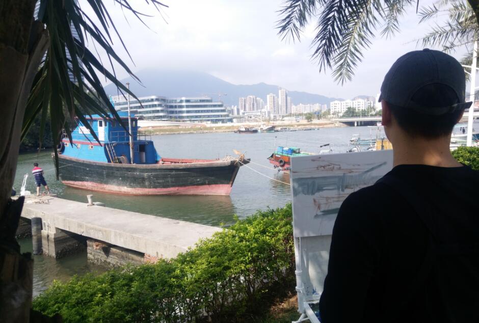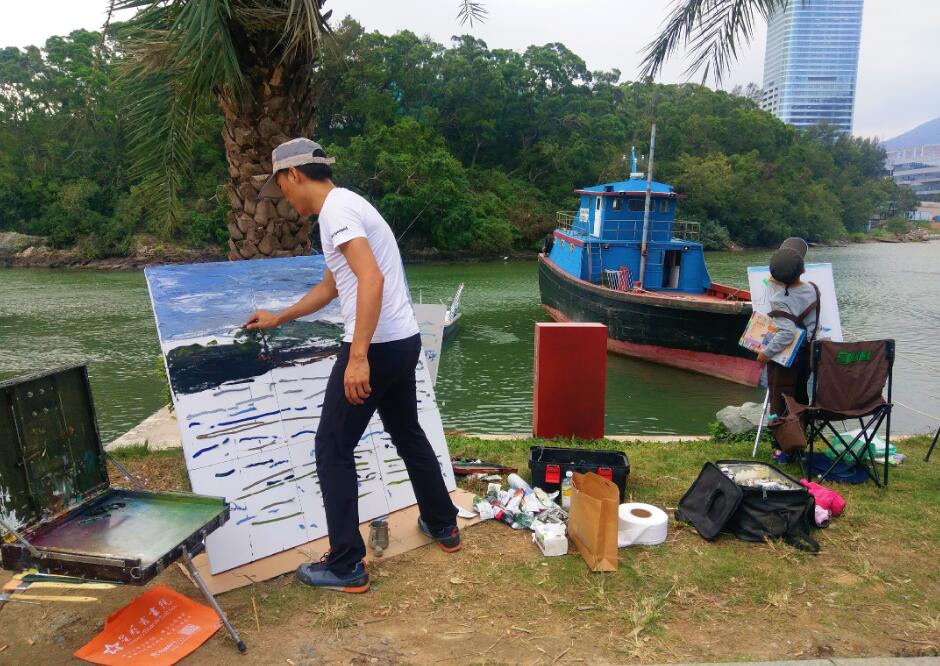 優(yōu)美的景色映入畫家們眼簾,點(diǎn)燃了他們的創(chuàng)作激情。來到鹽田之后,藝術(shù)家們紛紛找好寫生地點(diǎn),擺好畫架,迅速進(jìn)入創(chuàng)作的狀態(tài)。他們當(dāng)中一部分來到了鹽田漁港,鹽田海鮮街后的小漁村避風(fēng)港。蔚藍(lán)的大海、旁邊的綠樹、避風(fēng)塘內(nèi)停泊的船只、白色的海鳥、釣魚的人以及遠(yuǎn)方火熱的建設(shè)場景都呈現(xiàn)在畫家的筆端;另一部分藝術(shù)家來到了位于三洲田深圳會計進(jìn)修學(xué)院的梧桐溪谷,小橋流水人家、奇石山林則一一被傾注于畫紙。