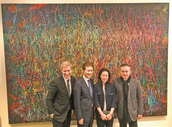 圖為吳建民(左二)、曾梵志(右一)等在畫作前合影。 (張朔 攝)
