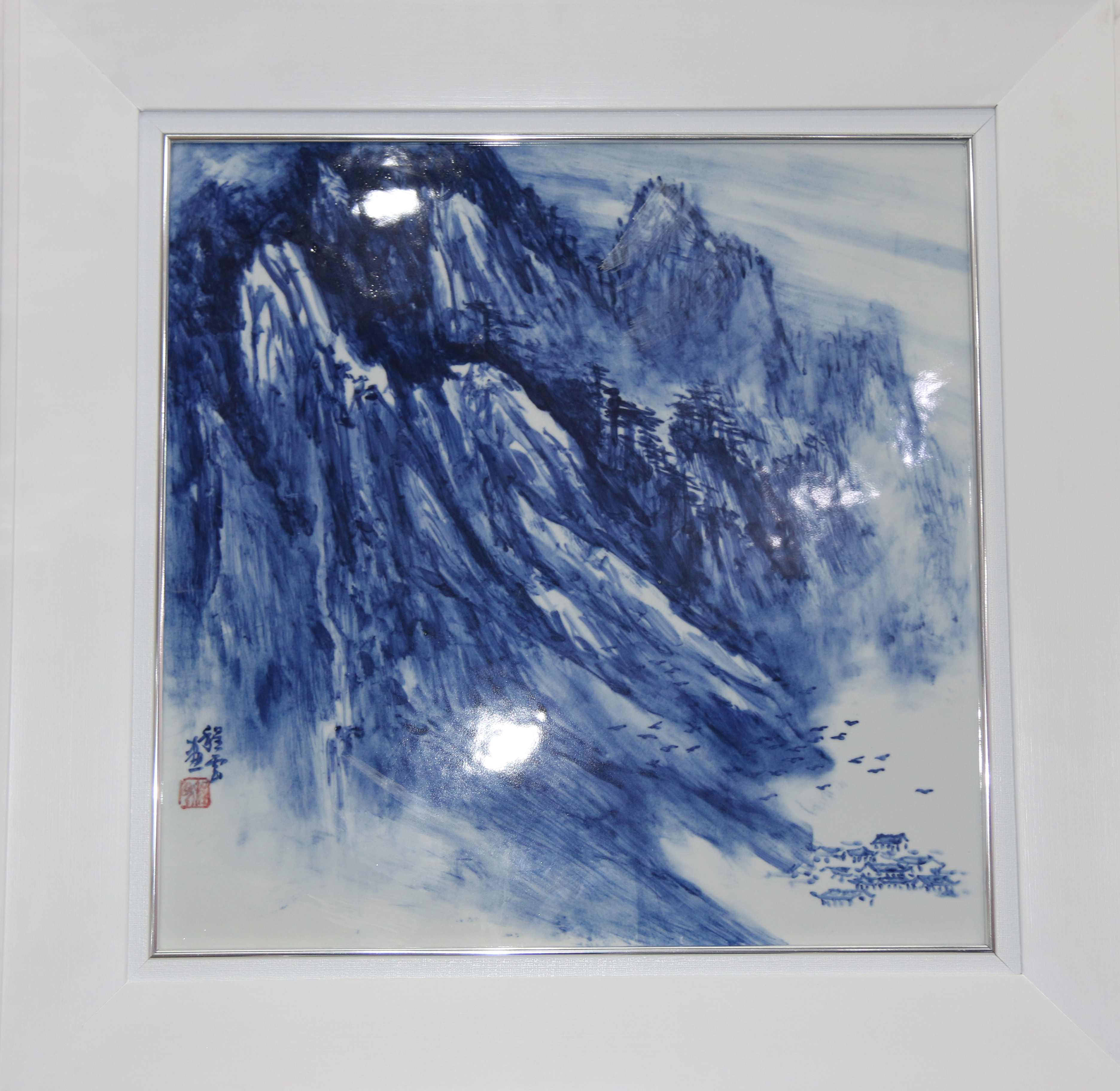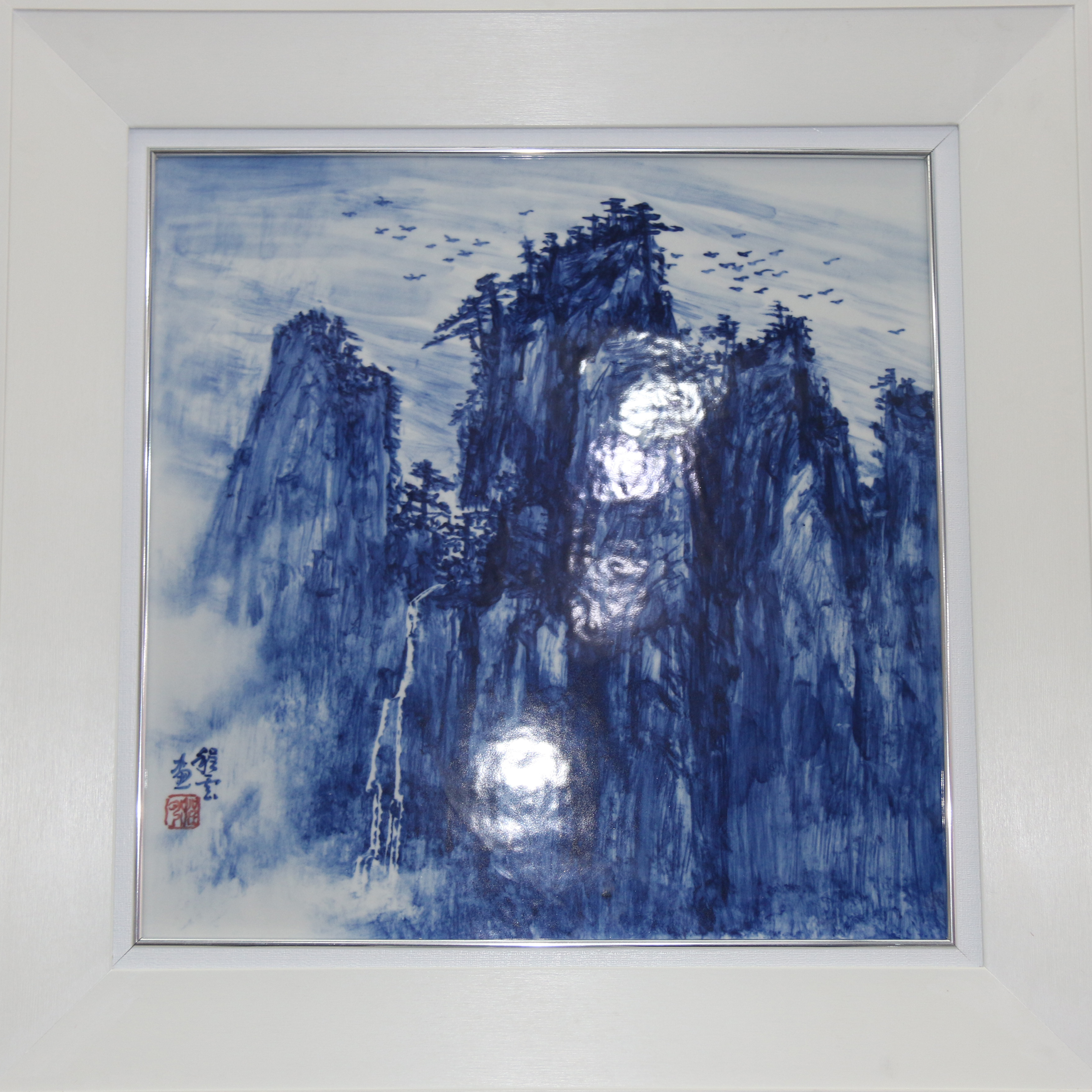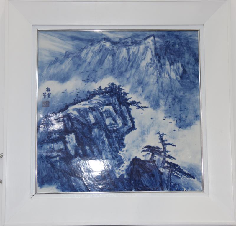 傳統(tǒng)的青花瓷板畫運(yùn)用天然鈷料在白泥上進(jìn)行繪畫裝飾,再罩以透明釉,然后在高溫1300攝氏度上下一次燒成,使色料充分滲透于坯釉之中,呈現(xiàn)青翠欲滴的藍(lán)色花紋,顯得幽倩美觀,明凈素雅。