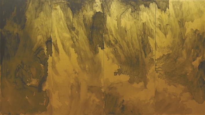 此次展出的作品《山外之山中》泥金四條屏令人耳目一新。他借助屏風(fēng)的形式,使用泥金這一材料,以大開大闔的磅礴氣勢,展現(xiàn)了蘇軾筆下“不識廬山真面目,只緣身在此山中”的意境。