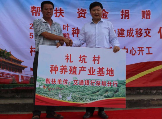 當(dāng)日,交通銀行深圳分行籌劃建設(shè)的茶山、種養(yǎng)殖基地、新一批雞苗和2017年度專項(xiàng)扶貧資金正式移交和撥付給禮坑村,并舉行了村民文化廣場(chǎng)開工奠基典禮。陳隃表示,交行深圳分行把幫扶禮坑村做為落實(shí)黨的政策的重點(diǎn)工作,做為國(guó)有銀行承擔(dān)政治責(zé)任、社會(huì)責(zé)任的重要出發(fā)點(diǎn),做為加強(qiáng)黨的建設(shè)的重要抓手,下一步圍繞三個(gè)轉(zhuǎn)變繼續(xù)深化扶貧工作,一是工作目標(biāo)轉(zhuǎn)向社會(huì)主義新農(nóng)村建設(shè),努力將禮坑村建設(shè)成新農(nóng)村建設(shè)示范村中的示范點(diǎn);二是工作方法從貧困戶脫貧向產(chǎn)業(yè)脫貧轉(zhuǎn)變,繼續(xù)發(fā)掘新項(xiàng)目,形成更加持續(xù)化的產(chǎn)值和收益;三是在制度建設(shè)上下功夫,強(qiáng)化社會(huì)主義新農(nóng)村建設(shè)的制度先行和制度示范。