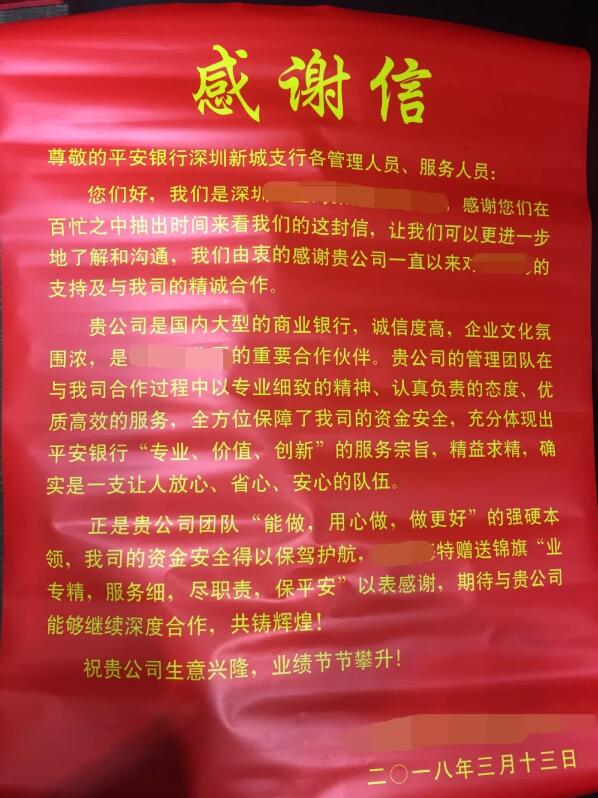 深圳新聞網(wǎng)訊 日前,平安銀行深圳分行分支行聯(lián)動想方設(shè)法勸阻客戶,成功堵截了一起詐騙,幫助客戶避免了500多萬元的資金損失,并協(xié)助警方抓獲了詐騙犯罪嫌疑人。此次成功堵截詐騙,得到了客戶和家屬的高度贊揚,專程送來了錦旗和感謝信,稱贊平安銀行“業(yè)專精、服務(wù)細、 盡職責、保平安”。