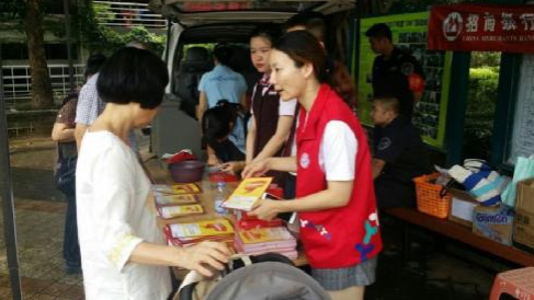 社區(qū)工作人員向居民介紹便民服務(wù)活動