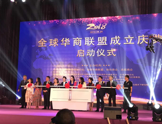 華商集團(tuán)董事局主席馬慧君、全球華商聯(lián)盟主席蔣文凱與嘉賓代表一起登臺,在全體嘉賓的共同見證下,宣告全球華商聯(lián)盟成立。