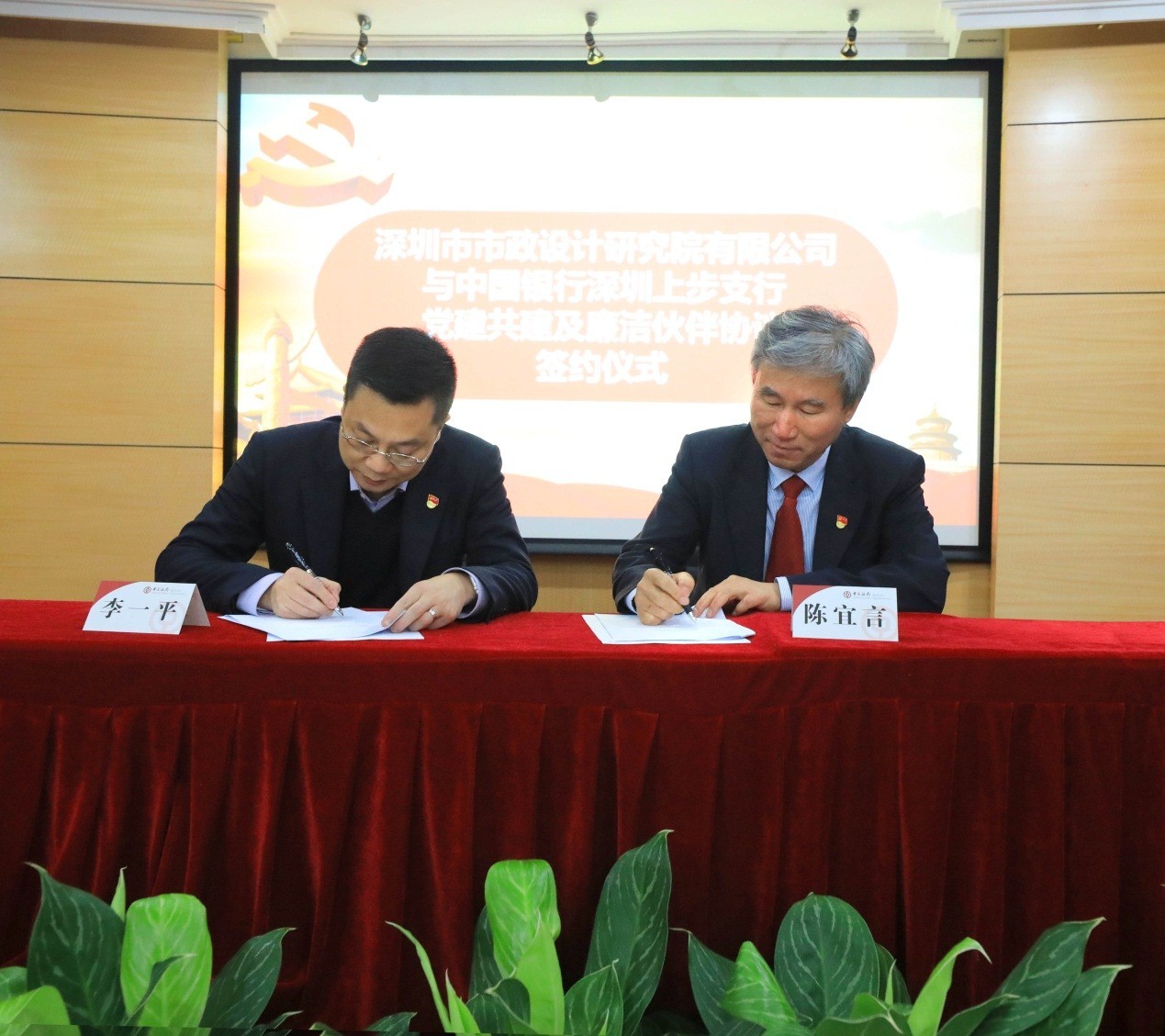 演講結(jié)束后,李一平和陳宜言分別代表中國(guó)銀行深圳上步管轄支行黨委和深圳市市政設(shè)計(jì)研究院有限公司黨委簽署了黨建共建和廉潔伙伴合作協(xié)議。
