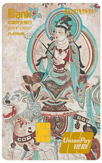 光大敦煌聯(lián)名信用卡卡面設(shè)計取材于敦煌壁畫,有敦煌大智文殊白金卡、敦煌天宮伎樂白金卡以及敦煌五百強盜成佛菁英白金卡三種信用卡。光大敦煌聯(lián)名信用卡的卡面設(shè)計靈感均來源于敦煌壁畫,大智文殊白金卡畫面為文殊菩薩結(jié)跏坐于青面獅虬首仙獅背上。文殊菩薩是專司智德、辯才第一的大菩薩,尊號“大智文殊”。天宮伎樂白金卡主體畫面為伎樂天,取材于莫高窟288窟,營造了佛陀講經(jīng)說法時佛國世界歡樂祥和的氛圍。五百強盜成佛菁英白金卡卡面設(shè)計取自“五百強盜成佛”的壁畫故事,佛用神通使被剜去雙眼的強盜重見光明,并對他們進行點化,五百強盜潛心苦修終成五百羅漢。光大敦煌聯(lián)名信用卡的卡面設(shè)計將傳統(tǒng)文化融入現(xiàn)代金融產(chǎn)品,極具敦煌文化的風(fēng)格。