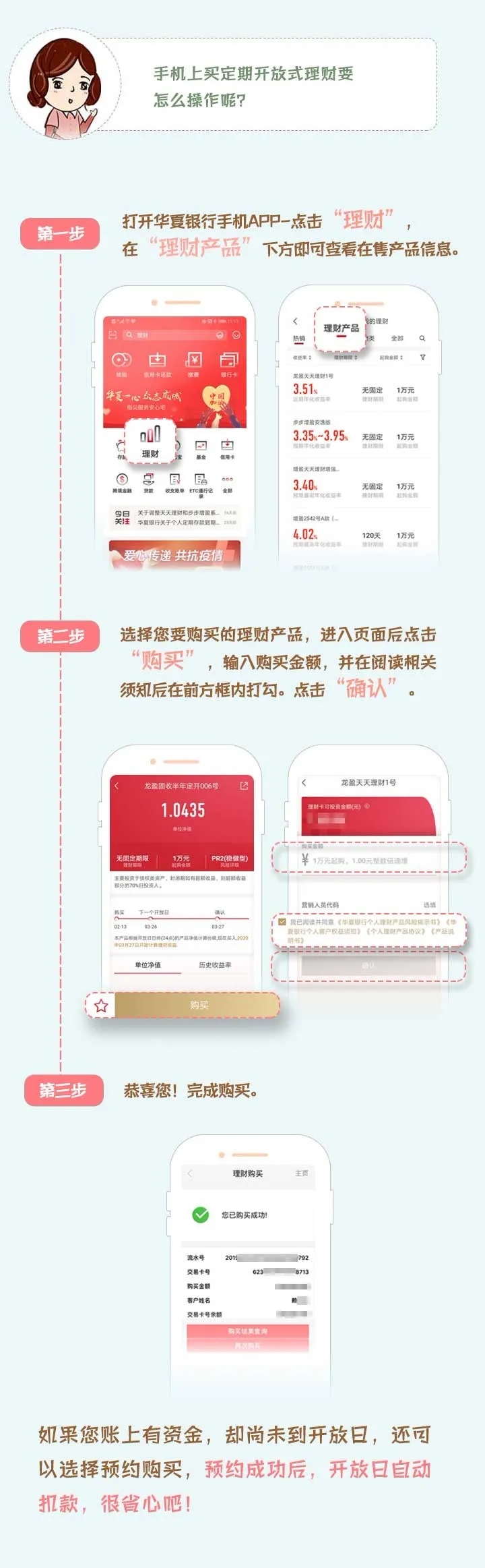 B:盡管足不出戶,您依然能享受著華夏銀行便捷安全的線上服務(wù),開展投資理財業(yè)務(wù),辦理理財產(chǎn)品、信托產(chǎn)品、代銷證券類產(chǎn)品的認申購、贖回等。