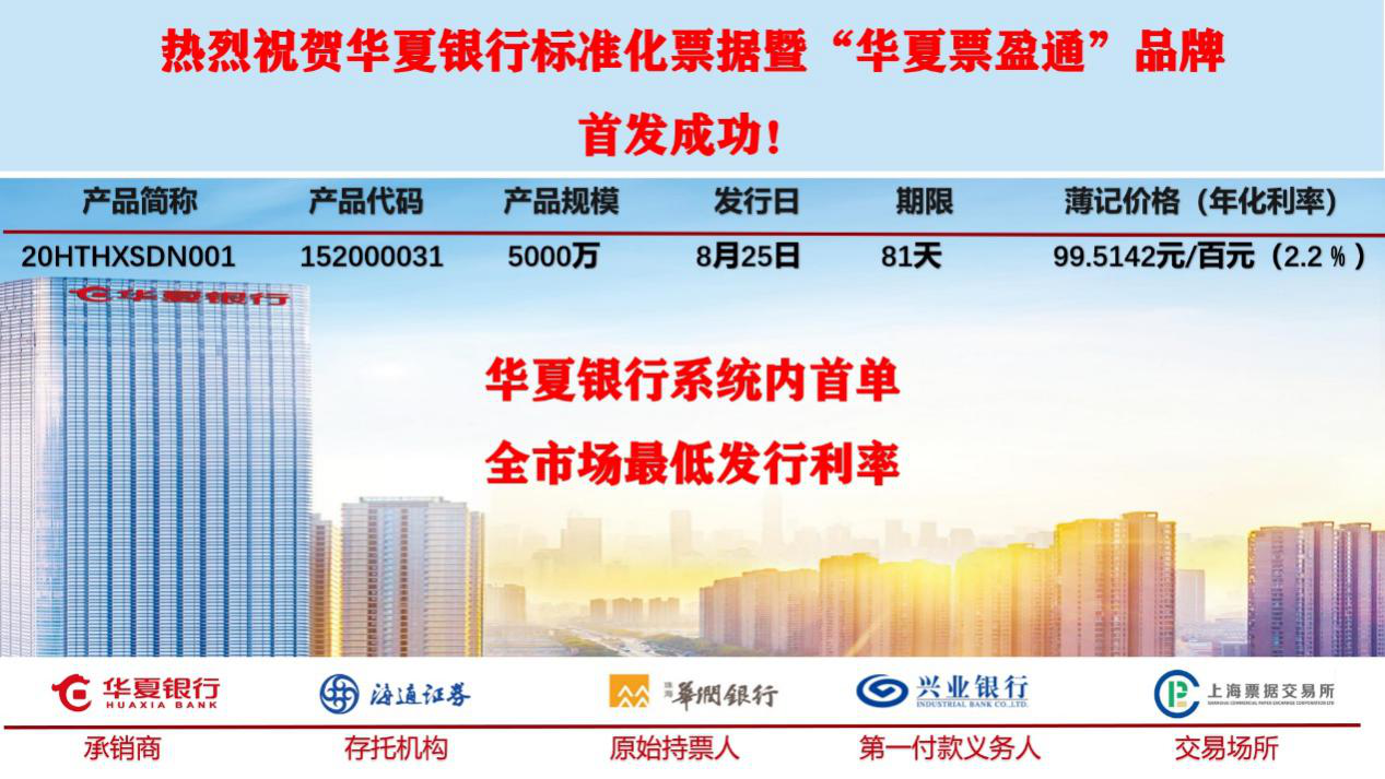 深圳新聞網(wǎng)·見圳客戶端2020年8月25日訊 今日,在深圳特區(qū)成立40周年來臨之際,記者從華夏銀行深圳分行獲悉,由該行承銷的海通證券華夏票盈通2020年度第一期標(biāo)準(zhǔn)化票據(jù)產(chǎn)品(產(chǎn)品簡稱:20HTHXSDN001)在該行系統(tǒng)內(nèi)率先成功發(fā)行。本期標(biāo)準(zhǔn)化票據(jù)發(fā)行規(guī)模5000萬,簿記價(jià)格99.5142元/百元面值(相當(dāng)于年化利率2.2%),發(fā)行利率創(chuàng)全市場可比同類型、同期限產(chǎn)品新低,將以更低的融資成本支持“穩(wěn)企業(yè)保就業(yè)”工作。