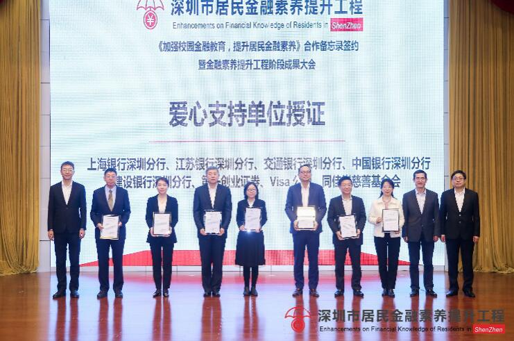 在隨后的授證儀式中,上海銀行深圳分行因?qū)ι钲谑芯用窠鹑谒仞B(yǎng)提升工程做出的突出貢獻(xiàn),及推動(dòng)深圳金融安全建設(shè)與可持續(xù)發(fā)展,被授予了“愛(ài)心支持單位”榮譽(yù)稱號(hào)。