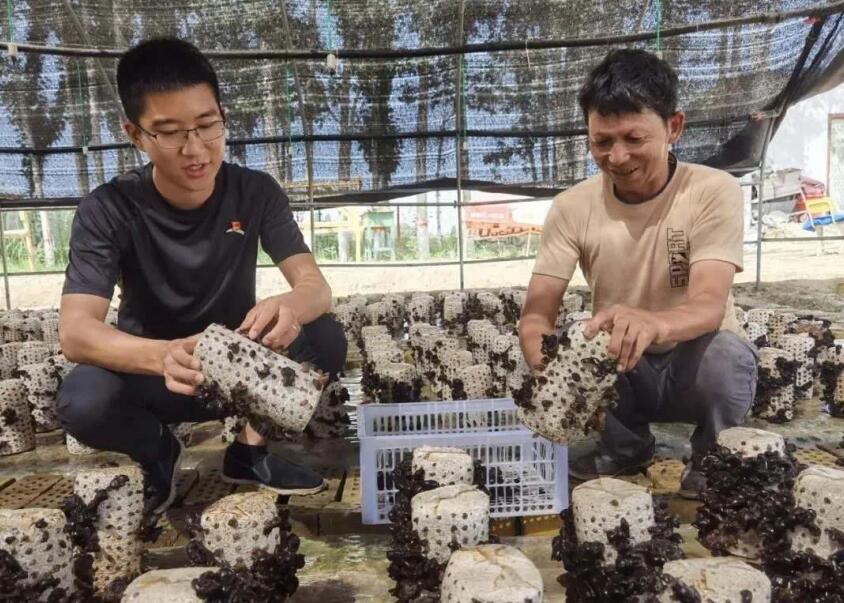 來(lái)自太平人壽新疆分公司的振興村駐村第一書記,正在查看木耳長(zhǎng)勢(shì)