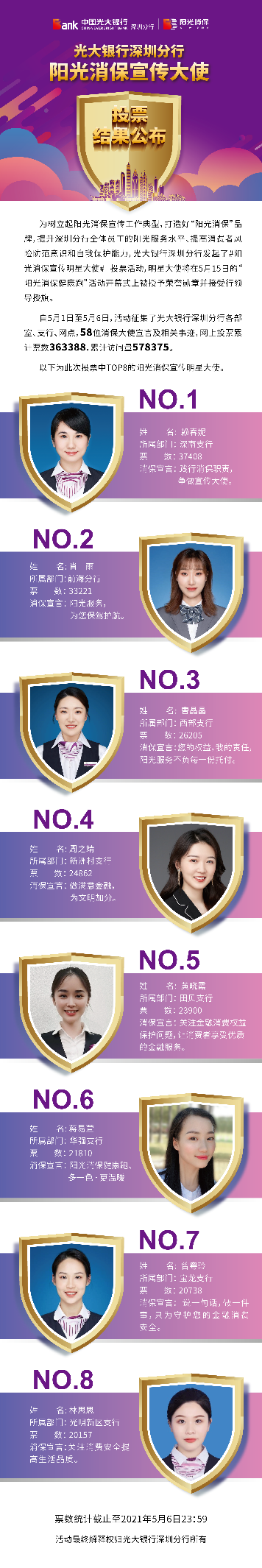 深圳新聞網·見圳客戶端2021年5月8日訊 昨日,光大銀行深圳分行“陽光消保宣傳明星大使”線上投票圓滿結束,從58名宣傳大使中投票產生了賴春妮、肖雨、曹晶晶、周之靖、黃曉霞、蔣易萱、曾粵玲、林思思8名陽光消保宣傳明星大使。明星大使將在5月15日的“陽光消保健康跑”活動開幕式上被授予榮譽勛章并接受行領導授旗。5月1日,光大銀行深圳分行發(fā)起了“陽光消保宣傳明星大使”線上投票,旨在樹立起陽光消保宣傳工作典型,打造“陽光消保”品牌,提升深圳分行全體員工的陽光服務水平,提高消費者風險防范意識和自我保護能力,提升光大在深圳地區(qū)的品牌影響力。投票活動得到社會熱烈響應,據統計,此次累計票數達363388次。