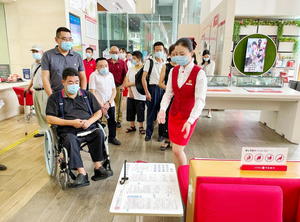 交流座談會結束后,全體黨員干部來到中信銀行深圳城市廣場旗艦支行現場體驗網點無障礙設施和服務,支部黨員與障礙人士現場溝通交流,為改進無障礙服務提出有益建議。