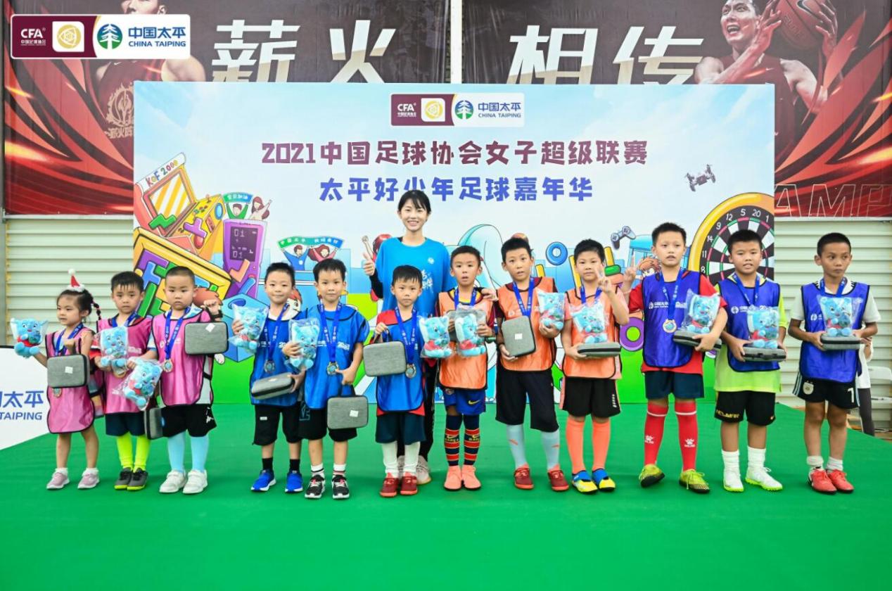 活動現(xiàn)場,5-10歲的兒童分組進行1V1趣味氣墊足球賽,經(jīng)過4輪激烈角逐,從參賽選手競選出12名選手被評為“太平好少年”稱號,由熊熙女士親自頒獎,并從優(yōu)勝者中抽取幸運球童獲得女足大禮包。除了氣墊足球賽之外,現(xiàn)場的小選手們還體驗了多項趣味互動游戲,也收獲了精美的參與禮品。