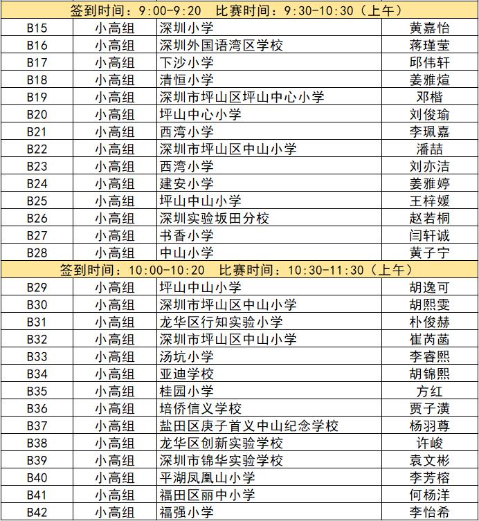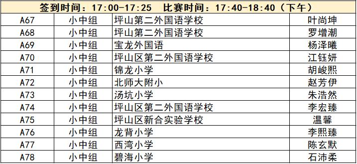 “誰(shuí)是故事大王·第五季”分為小中組和小高組,此次中行特約專(zhuān)場(chǎng)海選報(bào)名的學(xué)生將以脫稿的形式,不限主題,在限時(shí)5分鐘內(nèi),講述積極健康向上的故事。評(píng)委老師們將從四個(gè)維度進(jìn)行評(píng)分,其中內(nèi)容占50%、表現(xiàn)技巧占30%、儀態(tài)占10%,以及時(shí)間掌控、創(chuàng)意特色呈現(xiàn)等占10%。最終,本場(chǎng)活動(dòng)將選拔出部分學(xué)生晉級(jí)“誰(shuí)是故事大王·第五季”深圳市復(fù)賽,他們將和來(lái)自指定校園分賽區(qū)、特約專(zhuān)場(chǎng)以及線上分賽區(qū)的選手一起爭(zhēng)奪深圳市決賽名額?,F(xiàn)將上場(chǎng)順序(即所在小組的序號(hào)順序)、名單、簽到時(shí)間、比賽時(shí)間公布如下:
