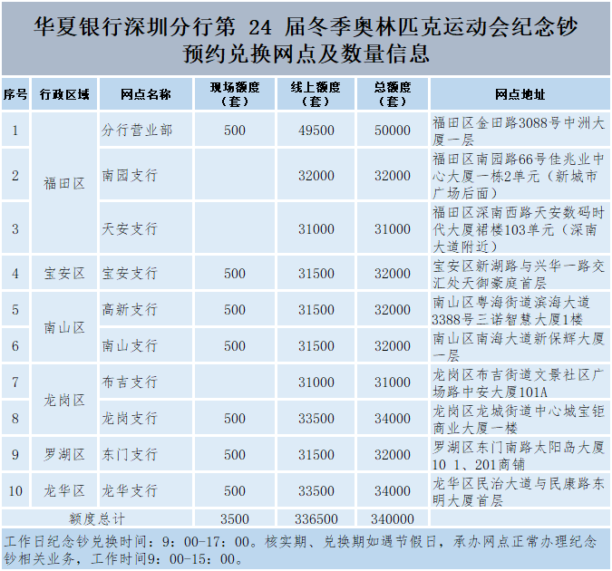 華夏銀行深圳分行共10家網(wǎng)點(diǎn)承辦冬奧紀(jì)念鈔發(fā)行工作。為方便老年客戶預(yù)約紀(jì)念鈔,該行7家網(wǎng)點(diǎn)開放線下預(yù)約,市民可持有效的第二代居民身份證原件至公告的現(xiàn)場(chǎng)預(yù)約網(wǎng)點(diǎn)辦理預(yù)約。紀(jì)念鈔先到先得,額滿為止。