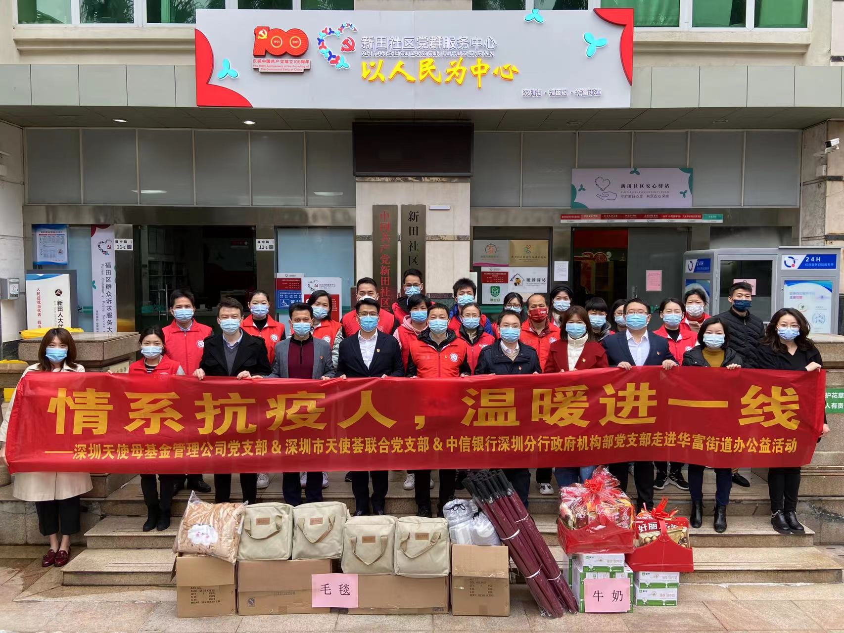 據(jù)了解,近日中信銀行深圳分行政府機構(gòu)部黨支部與深圳市天使母基金管理公司黨支部、深圳天使薈聯(lián)合黨支部到福田華富街道新田社區(qū)開展了“情系抗疫人,溫暖進一線”活動;信息技術(shù)部黨支部赴羅湖南湖街道海燕廣場核酸檢測點、后海支行黨支部赴南山海信廣場核酸檢測點、寶城支行前往寶安海雅繽紛城廣場核酸檢測點進行慰問,用實際行動支援抗疫工作。慰問了一線抗疫工作人員,同時為社區(qū)提供了充電寶、毛毯、雨傘、食品、飲品等防疫物資。寒冷中,熱騰騰的姜茶不僅讓抗疫工作者舒緩了疲憊,更讓他們頓感心中溫暖。