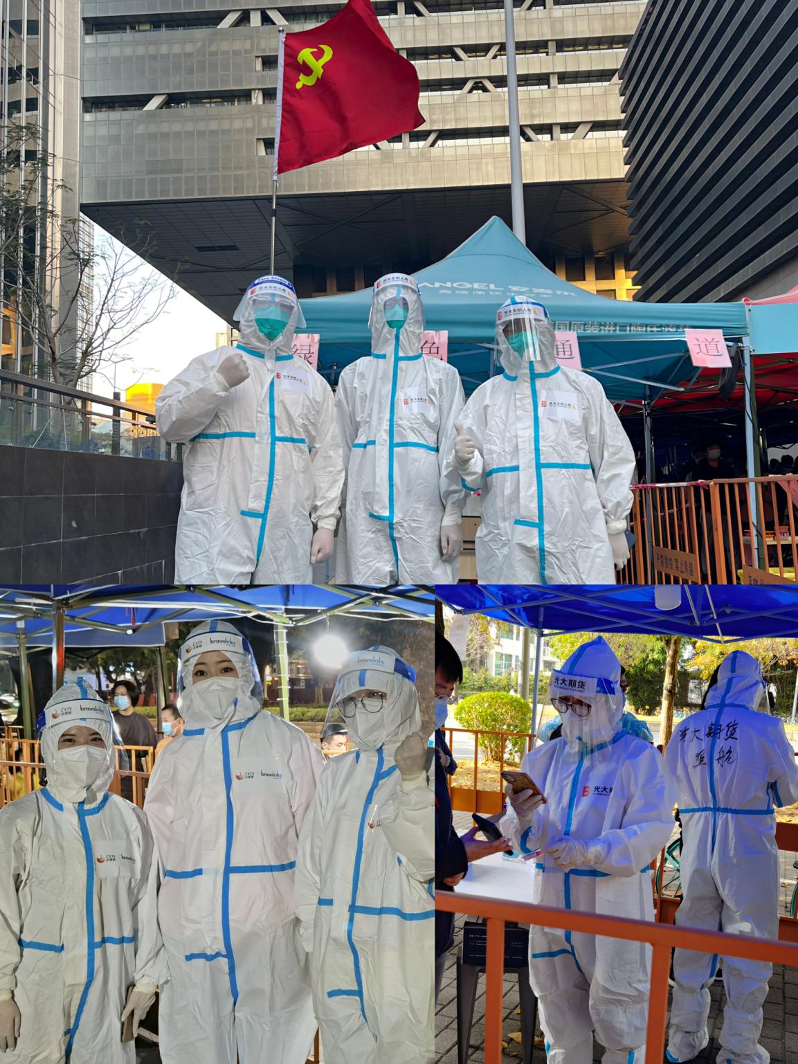 在疫情防控的關(guān)鍵時(shí)期,深圳分行黨委堅(jiān)決貫徹落實(shí)當(dāng)?shù)卣姆揽匾螅中悬h委書(shū)記、行長(zhǎng)韓學(xué)智同志緊急召開(kāi)黨委會(huì)議,啟動(dòng)應(yīng)急預(yù)案,積極部署并投入疫情防控工作,確保日常營(yíng)運(yùn)和客戶服務(wù)等工作有序運(yùn)轉(zhuǎn)。在深圳福田區(qū)金融工作局的組織與號(hào)召下,分行黨委要求全體黨員干部發(fā)揮先鋒模范作用,主動(dòng)為社區(qū)疫情防控工作提供志愿服務(wù)。分行黨委委員們率先垂范,分頭帶領(lǐng)黨員干部奔赴社區(qū)慰問(wèn)抗戰(zhàn)一線工作人員,并犧牲周末休息時(shí)間深入社區(qū)核酸采樣點(diǎn),脫下西裝變身“大白”。深圳分行各黨支部和團(tuán)支部先后組織開(kāi)展各類志愿服務(wù)累計(jì)時(shí)長(zhǎng)超過(guò)100小時(shí),活躍在防疫抗疫一線的同志們?cè)谌ΡU蠌V大群眾金融服務(wù)需求的同時(shí),和醫(yī)護(hù)工作者一同守護(hù)著千家萬(wàn)戶。作為集團(tuán)駐深企業(yè)協(xié)同工作的牽頭單位,分行牽頭組建駐深企業(yè)志愿者先鋒隊(duì),緊急投身福田區(qū)抗擊疫情的各個(gè)戰(zhàn)線和各個(gè)角落,不分晝夜、不論疲倦、以實(shí)際行動(dòng)踐行初心、使命和擔(dān)當(dāng),弘揚(yáng)新時(shí)代共產(chǎn)黨人的奉獻(xiàn)精神?!叭绻皇怯H身體驗(yàn)志愿者服務(wù)工作,永遠(yuǎn)不知道抗疫人員的工作是如此辛苦!有多少人在負(fù)重前行才確保了深圳市民有序和安寧的生活。此刻很想擁抱可親可敬的你們,防護(hù)服雖然阻擋了我們的擁抱,但無(wú)法阻擋我們一起抗擊疫情的心?!币晃恢驹刚哌@樣記錄到。