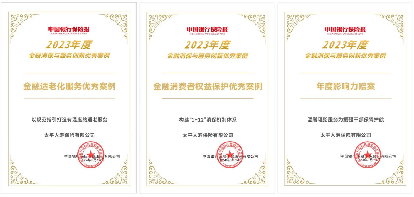保護(hù)金融消費者權(quán)益是金融業(yè)落實“以人民為中心”思想的重要體現(xiàn)。作為金融央企成員公司,太平人壽秉持中國太平集團(tuán)“央企情懷、客戶至上、創(chuàng)新引領(lǐng)、價值導(dǎo)向”的戰(zhàn)略要求,為滿足人民群眾日益增長的美好生活需求貢獻(xiàn)太平力量。此次太平人壽多項服務(wù)案例入選“2023年度服務(wù)創(chuàng)新案例”,凸顯行業(yè)、專家對太平人壽高質(zhì)量保險服務(wù)的認(rèn)可。