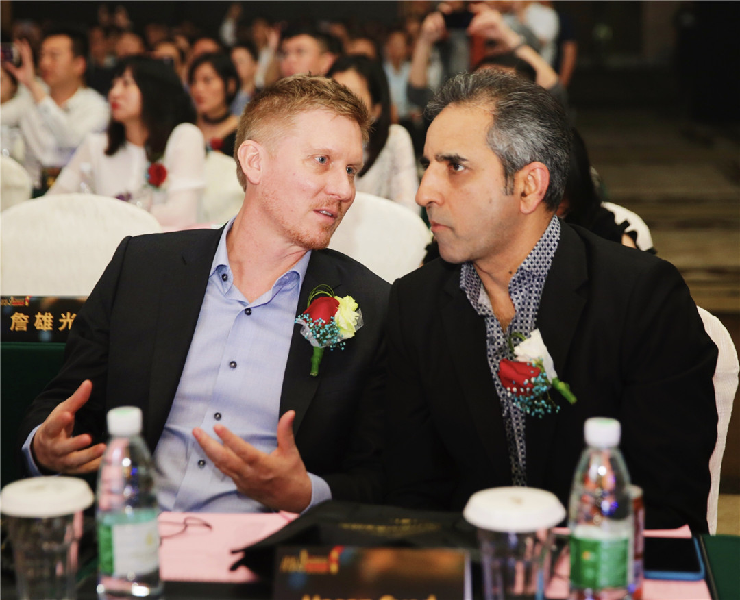 △中央美術(shù)學(xué)院建筑設(shè)計(jì)研究院院長(zhǎng)、博士生導(dǎo)師王鐵,美國Gensler上海公司總監(jiān)Hasan Syed為廣州設(shè)計(jì)師黃永才頒發(fā)“最佳娛樂空間設(shè)計(jì)獎(jiǎng)”