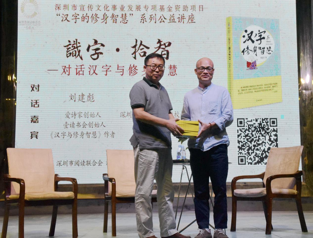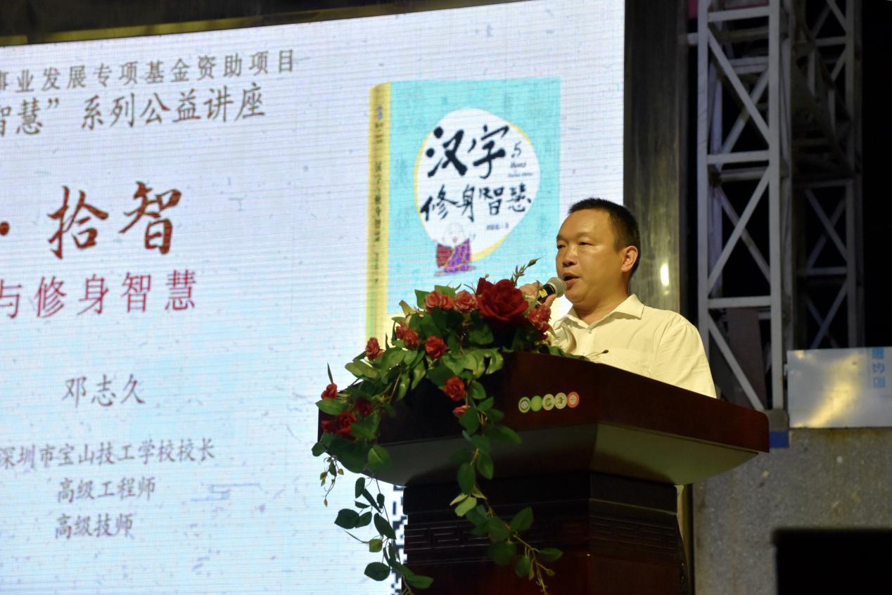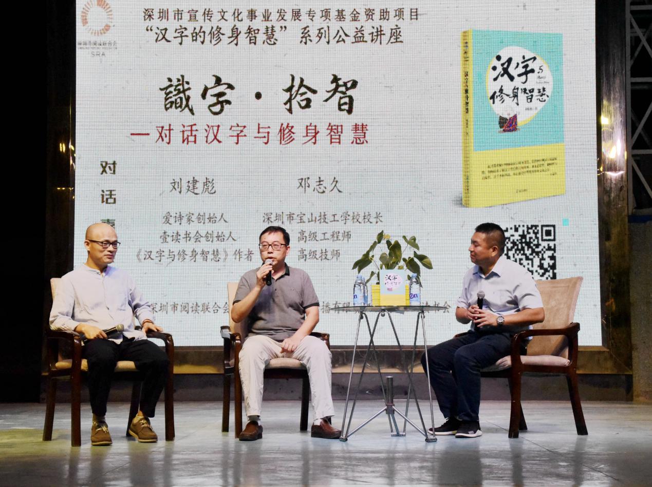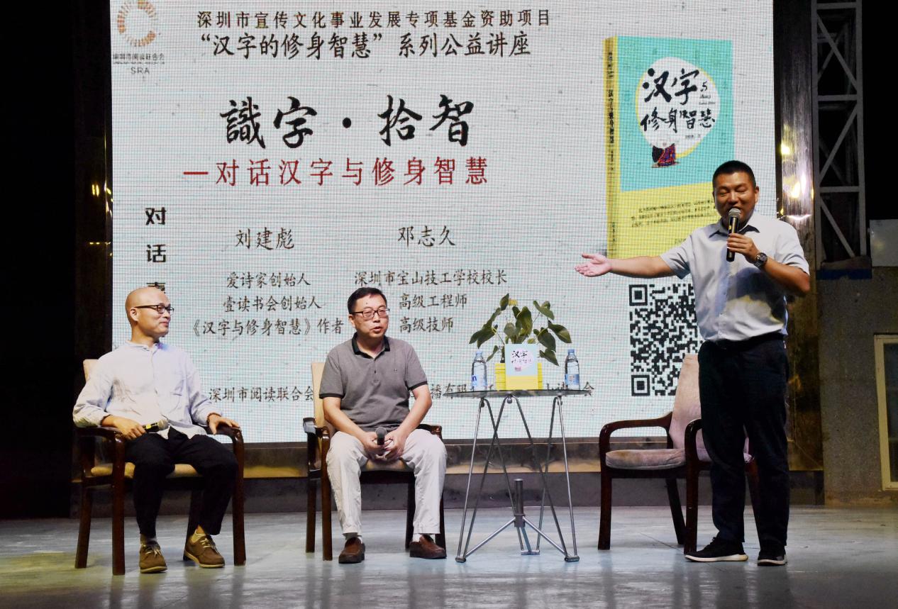 深圳新聞網(wǎng)訊 9月18日晚上7時(shí),由深圳市閱讀聯(lián)合會(huì)、深圳市壹書文化傳播有限責(zé)任公司和寶山讀書會(huì)共同主辦的“‘識字拾智’——對話漢字與修身智慧”公益文化講座在寶山技工學(xué)校寶山大舞臺拉開了序幕。據(jù)悉,這是由深圳市宣傳文化事業(yè)發(fā)展專項(xiàng)基金資助項(xiàng)目“漢字的修身智慧”的第三場公益文化講座,以劉建彪《漢字與修身智慧》新書分享為契機(jī),傳播漢字正能量,讓更多的青少年識字長智,領(lǐng)略漢字文化之精妙。