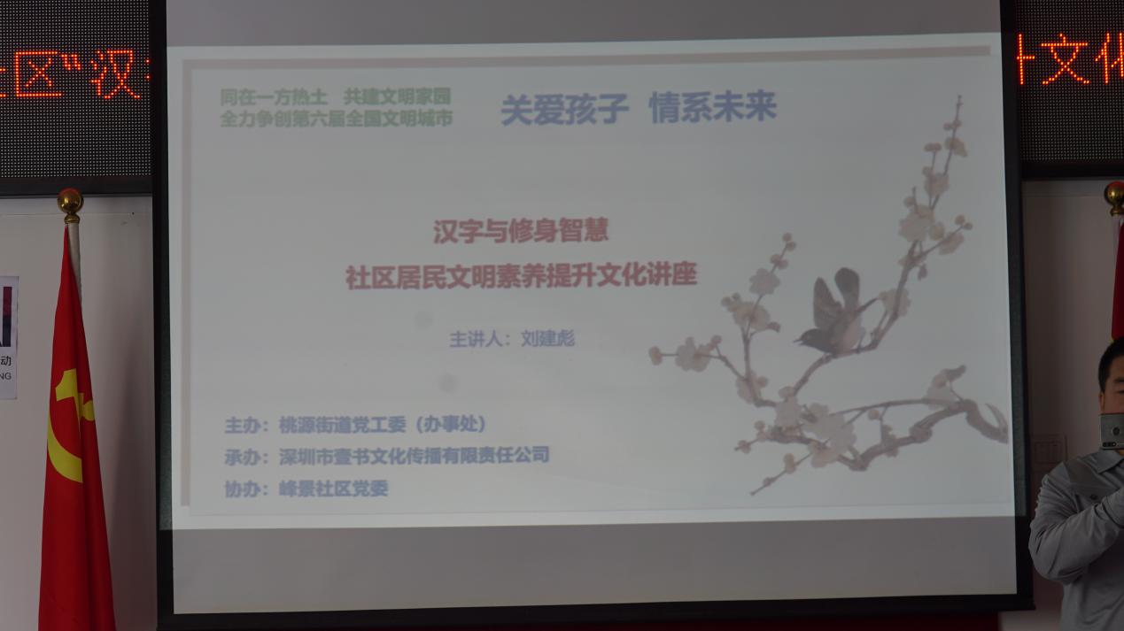 11月8日下午,該項目首場講座在峰景社區(qū)工作站拉開了序幕,本次講座由桃源街道黨工委(辦事處)主辦、深圳市壹書文化傳播有限責任公司承辦、峰景社區(qū)黨委協(xié)辦,邀請到壹讀書會創(chuàng)始人、知名閱讀推廣人、《漢字與修身智慧》的作者劉建彪擔任主講嘉賓。在深圳爭創(chuàng)全國文明城市的當下,桃源街道辦積極響應(yīng)市委市政府的號召,不斷探索籌劃、推陳出新,以“‘同在一方熱土共建文明家園’——全力爭創(chuàng)第六屆全國文明城市”為文明創(chuàng)建標語,開展題為“學習漢字與修身智慧,以傳統(tǒng)文化力量促文明”的文化講座,為創(chuàng)建文明城市貢獻一份力量。