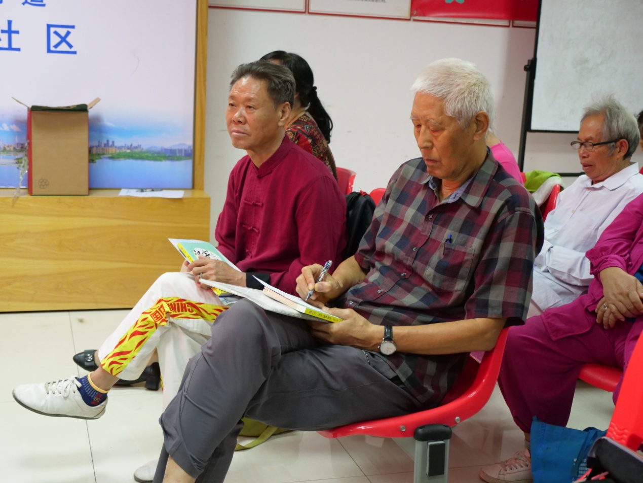 活動現(xiàn)場,珠光社區(qū)的叔叔阿姨們坐得整整齊齊,人手一本《深圳市民公約》冊子和《漢字與修身智慧》學習資料,認真地翻閱著。
