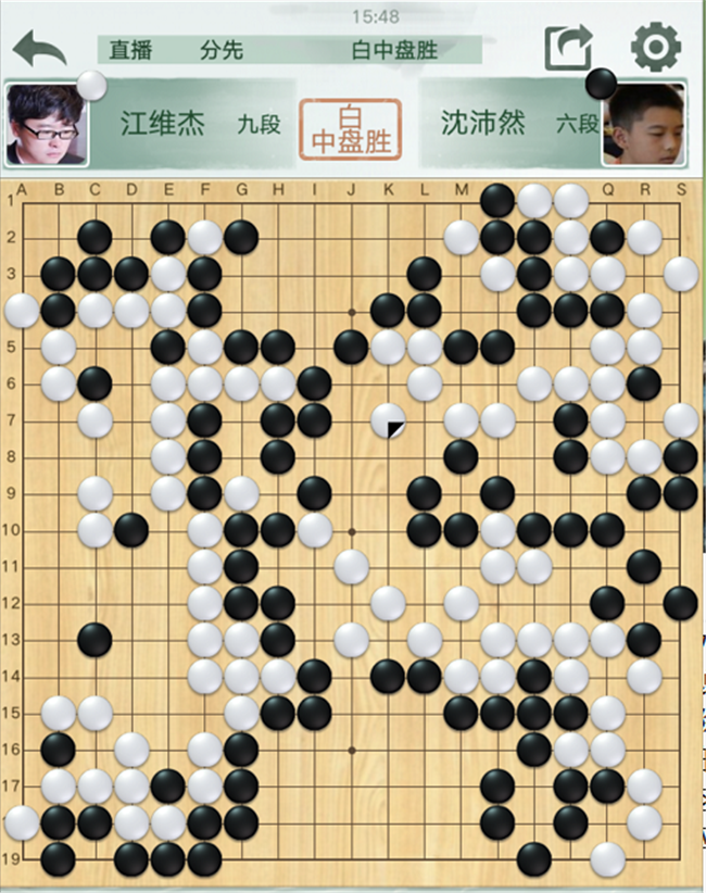 第四臺(tái),沈沛然執(zhí)黑對(duì)陣世界冠軍江維杰。黑開局不利,右下角65緩手導(dǎo)致差距拉大。