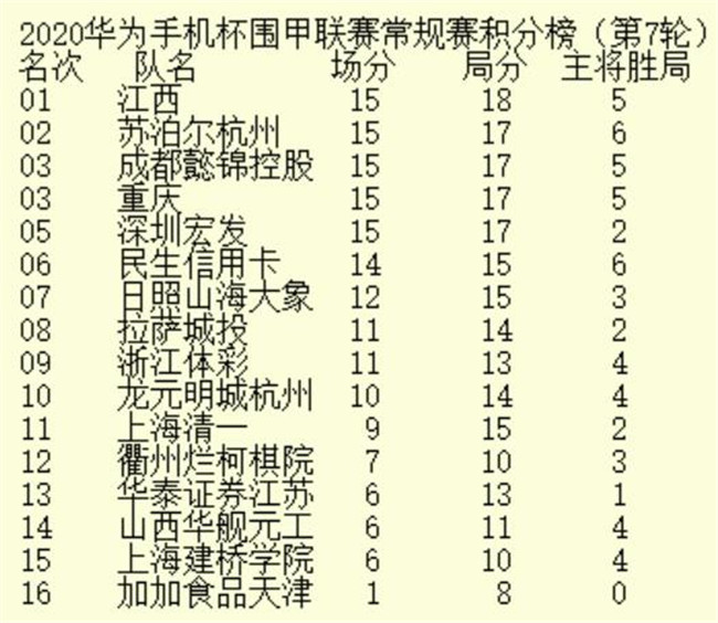 《2020年華為手機(jī)杯中國(guó)圍甲聯(lián)賽第七輪積分榜》