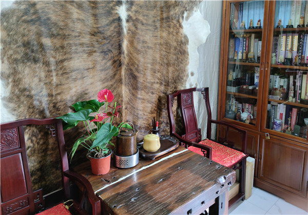 俗話說得好:見識一個素養(yǎng),看看他的書房就知道了!那么,寧起興老師的書房是什么樣的呢?第一印象:簡潔、古樸、有趣味。一眼掃去,臨窗一張紅木桌,兩個裝得滿滿的老書柜,兩張烏黑發(fā)亮的南官帽椅,中間配有一張老舊的喝茶的原木桌,正上方的墻面掛著一整張大大的南美阿根廷牛皮。墻上橫掃,掛有“室靜書馨”的書法作品,一張古琴,一把薩克斯,幾份有關他篆刻宣傳的剪報,還有星星點點的各類鈴鐺。細看呢:書柜里的篆刻工具書,有大部頭的字典、印譜和系列叢書,也有與篆刻相關的文化類書籍,大多插滿了顏色各異的標簽,可見寧老師讀書的細致與用心。紅木大桌上有一對大音箱,是原裝進口的德國貨;桌子旁,有一正方形的小桌特別顯眼,寧老師帶著些許自豪的神態(tài)介紹說,鉗臺是德國進口的,鋸子也是原裝進口的,那個刻銅印的印盤是定制的。還有,他所用的刻刀頂端印有l(wèi)ogo,是小篆“寧”字與工字的合寫,該刀鋼材鈷含量為17%,也是定制的。正所謂“工欲善其事,必先利其器”,寧老師深以為然。是以,他在工具上追求“高精尖”甚至不惜工本。