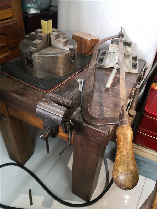 船木工作臺擺的全是寧老師的心肝寶貝:進口或定制的篆刻臺、鋸、刀等。