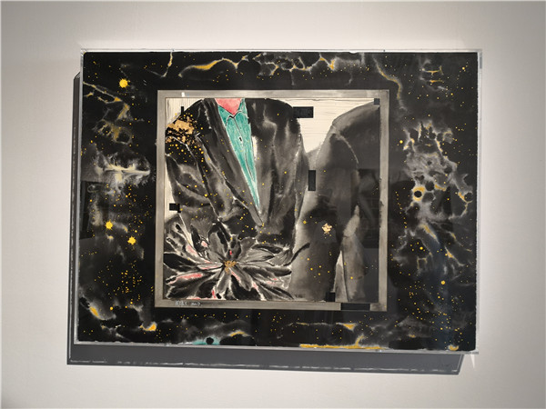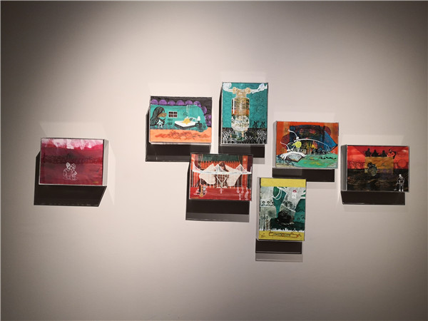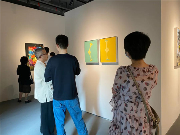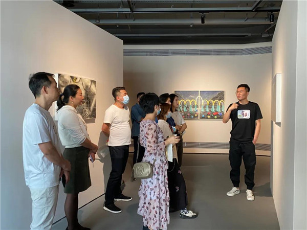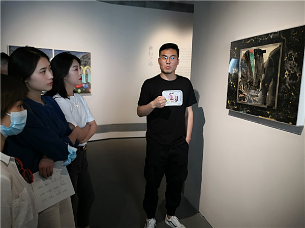 聯(lián)展現(xiàn)場(chǎng)三位作者向參觀者介紹創(chuàng)作經(jīng)歷及畫(huà)作意蘊(yùn)。