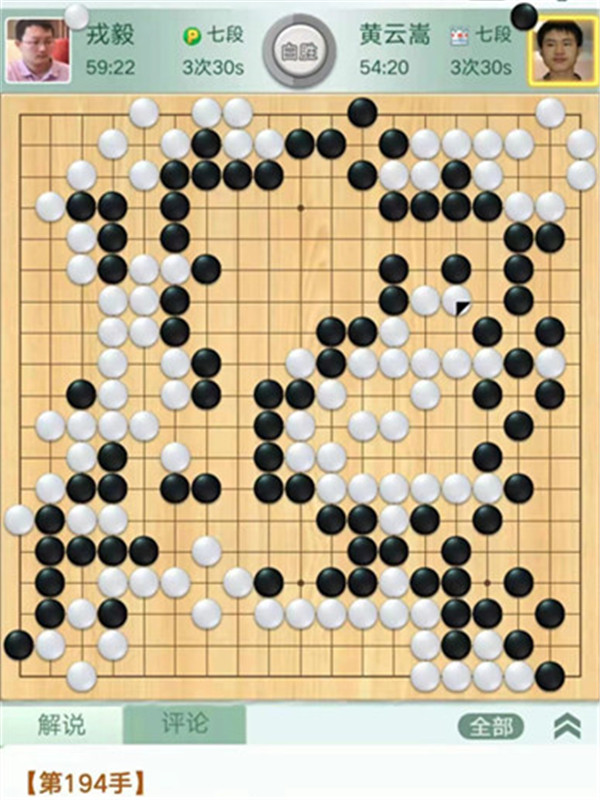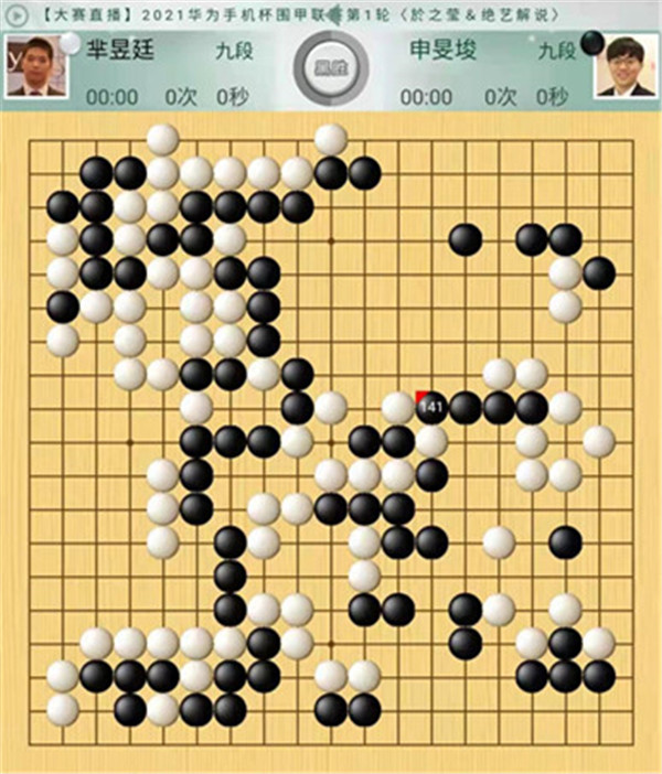 今日比賽中,申旻俊主將執(zhí)黑對陣新二冠羋昱廷,開局左上角申旻俊配合小米使出羋氏飛刀,結(jié)果是飛刀不成功黑棋局面領(lǐng)先。中盤黑棋攻擊中央白棋時,白棋脫先搶占實(shí)地。被黑手起刀落斬殺大龍,局終??炱迮_,去年屢立戰(zhàn)功的戎毅七段執(zhí)白對陣黃云嵩七段,行棋穩(wěn)健,占居三個角之后,又在中間活出一大塊,行棋至194手勝。三臺陶欣然八段對陣陳賢八段,行棋222手白中盤勝。四臺時越九段對趙晨宇一戰(zhàn),行至284手,以四分之三子微弱優(yōu)勢取勝。