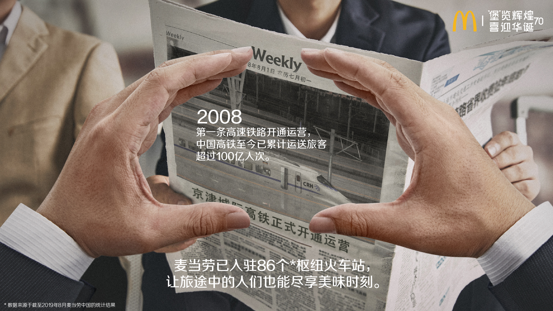 便捷出行,美味隨心:2008年,中國第一條高速鐵路——京津城際鐵路正式開通。高鐵不僅改變了人們的出行方式,更推動了區(qū)域經(jīng)濟發(fā)展。麥當勞已入駐86個樞紐火車站,為旅客提供便捷美味。