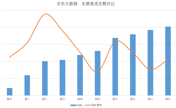 今年春節(jié),線上生鮮品類的需求量大幅增長。京東大數(shù)據(jù)顯示,整個春節(jié)期間,京東生鮮成交額同比增長215%,為消費者提供了近1.5萬噸生鮮產品,蔬菜成交額同比增長近450%。在京東到家平臺上,除夕至大年初九,糧油副食商品銷售額同比去年春節(jié)增長736.40%,肉品同比增長711.11%,休閑食品增長527.16%,蔬菜增長441.1%,水果增長378.8%,米面糧油、肉禽蛋奶、蔬菜水果和水餃餛飩等速凍食品均十分暢銷。