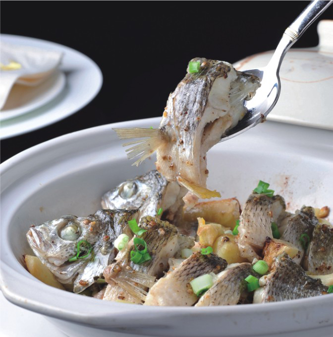廣東人也會(huì)把立魚叫做“黃腳立”,立魚生長很慢,脂肪含量低,絲毫不見肥膩,最討女仔喜歡。立魚如果清蒸,則肉質(zhì)偏韌;雷大廚改以鹽焗,用砂鍋爆香姜蔥蒜,魚肉先經(jīng)鹽、糖、少許油、生粉和胡椒粒撈一撈,下鍋后蓋蓋子焗上五分鐘,入味后經(jīng)砂鍋一焗,緊緊鎖住肉汁。