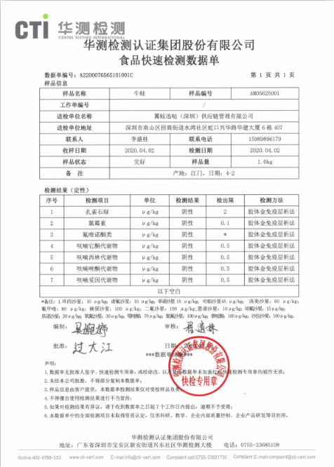 蛙來噠創(chuàng)始人羅清表示:對于食品安全管理,蛙來噠嚴(yán)格要求牛蛙來貨供應(yīng)商,每批來貨提供合格的第三方檢測報告,經(jīng)歷2019年10月的抽檢之后,我們增加了來貨后的再一次第三方送檢,并保證每批貨都送檢,以此保證食品安全質(zhì)量,并將繼續(xù)升級自我檢測標(biāo)準(zhǔn)。