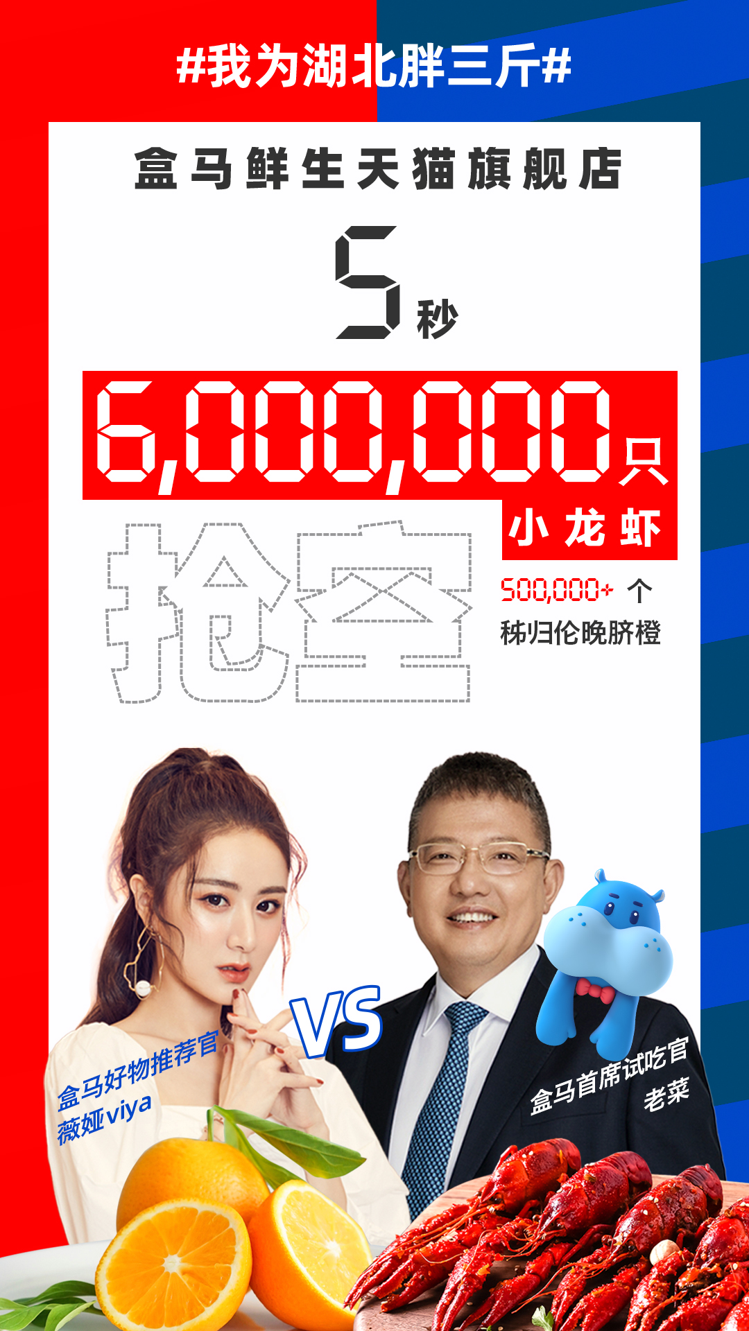 4月21日晚,盒馬總裁侯毅(花名老菜)做客淘寶薇婭直播間,為湖北農(nóng)產(chǎn)品帶貨。侯毅直播時長半小時,但僅用時5秒鐘,盒馬鮮生天貓旗艦店內(nèi),網(wǎng)友就買光了600萬只湖北小龍蝦。