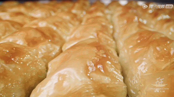 這還沒到核心。巴克拉瓦最關(guān)鍵的步驟是熬糖,只有資歷最老的師傅才能掌握,溫度、酸度、水、時間讓糖液達到平衡,于是,我們看到完美的最后一步: