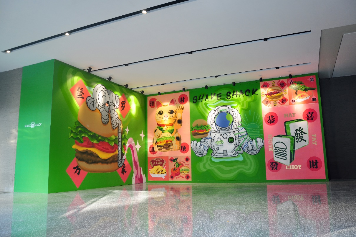 圍擋的室內(nèi)部分采用創(chuàng)新的互動(dòng)形式,由藝術(shù)家現(xiàn)場親自手繪完成的8幅單元涂鴉畫板組合而成。藝術(shù)家用摩登時(shí)尚的波譜藝術(shù),向當(dāng)?shù)刭e客們奉送出中國傳統(tǒng)的祝福及Shake Shack的活力熱情。