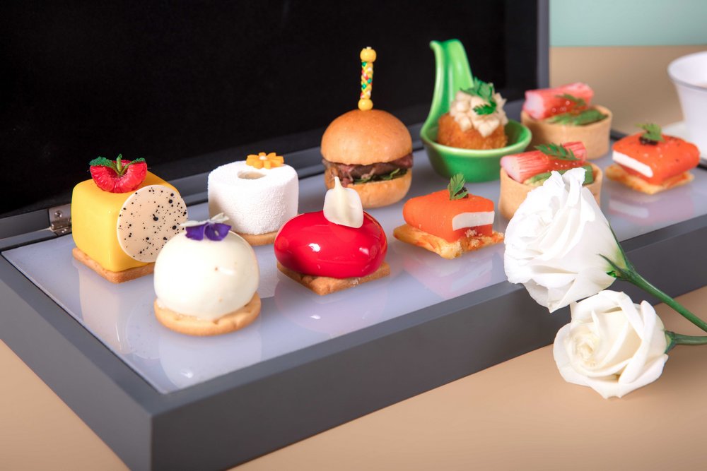 酒店餅房廚師長趙偉融匯創(chuàng)新,選用當(dāng)季新鮮花材與鮮爽水果,打造了數(shù)款意趣多彩的甜品佳作:茉莉百香果椰子蛋糕,茉莉花的清新邂逅酸甜的百香果與香濃的椰子,細(xì)品層疊交融的奇妙滋味;洛神花玫瑰蛋糕,玫瑰的馥郁悠長糅合洛神花的明快艷麗,一口便是春天;青檸春茶蛋糕,別具創(chuàng)意地將青檸和碧螺春茶融合,酸爽口感里裹挾著若隱若無的茶香;桂花米酒蛋糕,當(dāng)桂花飄進(jìn)米酒,花香伴著微醺,細(xì)膩綿柔,在唇齒間琢磨品味;水果“炸彈”,輕輕一敲,冰爽可口的水果傾瀉而出,果香四溢,是視覺和味覺的盛宴。咸點也是不可錯過的味蕾禮賞:肉質(zhì)鮮嫩的蟹肉和清新爽口的牛油果巧妙融合,呈現(xiàn)海陸鮮甜交匯的美妙體驗;細(xì)膩鮮美的三文魚,配上絲滑濃郁的奶油芝士和誘人的魚子醬,是一場舌尖的奢享。隨下午茶搭配的新鮮烘焙司康餅,花香果香四溢的花茶,更增添午后的曼妙意趣。