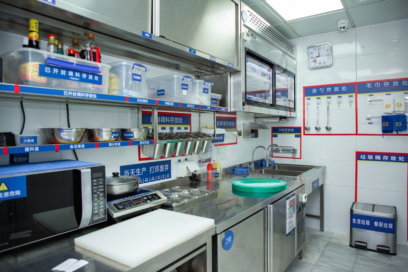 “右手邊是冷菜間,因為食安要求更高,我們都有專門的‘二次更衣室’,在這里更換衣服后,再進入對涼菜進行處理?!必撠熑吮硎?,在專門的涼菜區(qū)里,則可以看到櫥窗中整齊地貼上了諸如“A1圣女果”“B04魚豆腐”之類的標簽,同時備注“當天生產(chǎn)打烊廢棄”和“加工日期與廢棄日期”等具體操作指示?!懊客泶蜢群?,我們也會用紫外線燈對冷菜間進行半個小時的消毒?!必撠熑搜a充。