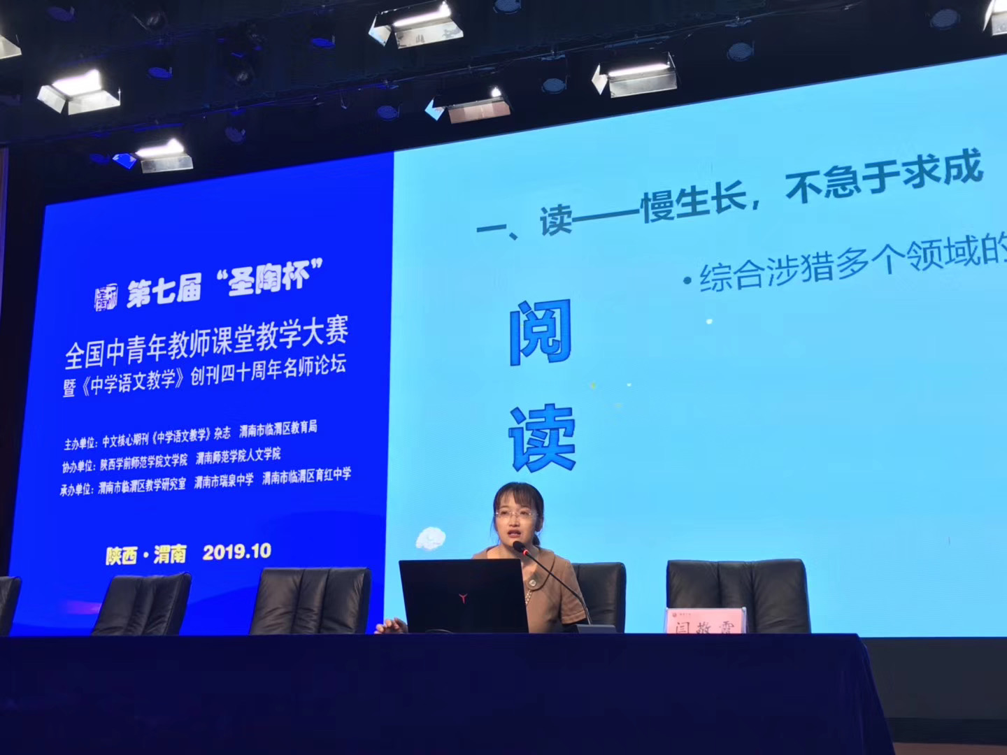 見圳客戶端·深圳新聞網2019年10月31日訊 日前,第七屆“圣陶杯”全國中青年教師語文課堂教學大賽暨《中學語文教學》創(chuàng)刊四十周年名師論壇在陜西渭南舉行,深圳市南山區(qū)中國科學院深圳先進技術研究院實驗學校閆敬霞老師受邀出席“名師論壇”,并做主題分享。