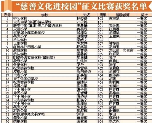 寶安日報2020年1月2日訊 2019年12月31日下午,寶安區(qū)慈善文化進校園征文比賽表彰暨2019年度工作總結會在寶安實驗學校會議室舉行。會上對征文比賽獲獎者和優(yōu)秀組織單位進行表彰。學生代表分享慈善故事,學校代表則分享慈善文化進校園經驗。此次慈善文化進校園征文活動是由區(qū)教育局、區(qū)慈善會、寶安日報社、寶安廣電中心共同主辦,征文主題是“慈善在我身邊”,活動在全區(qū)中小學生中進行征集。經過兩個月的征集和評比,最終評出3個組別的一、二、三等獎和優(yōu)秀組織單位。