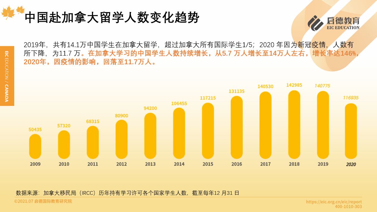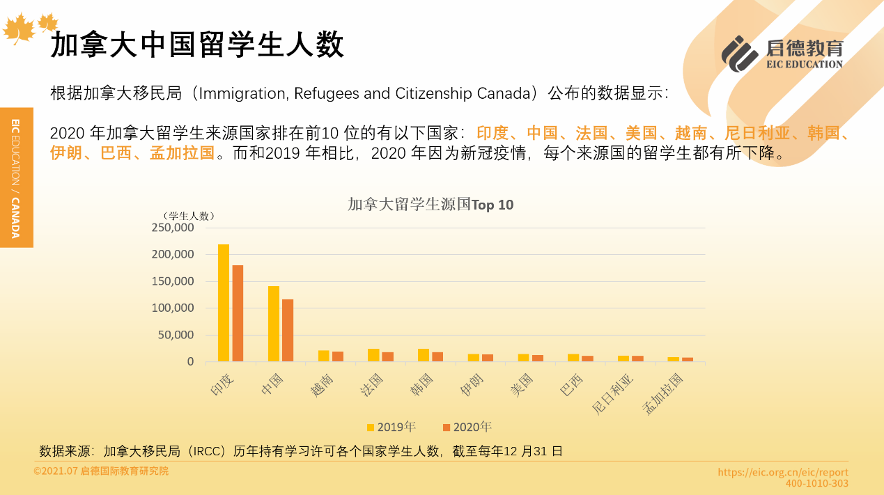 據(jù)加拿大移民局(IRCC)公布的數(shù)據(jù)顯示,2020年加拿大留學(xué)生來源國(guó)家排在前10位分別是:印度、中國(guó)、法國(guó)、美國(guó)、越南、尼日利亞、韓國(guó)、伊朗、巴西、孟加拉國(guó)。從2010年到2020年的11年間,在加拿大學(xué)習(xí)的中國(guó)學(xué)生人數(shù)持續(xù)增長(zhǎng),從5.7萬人增長(zhǎng)至14萬人左右,增長(zhǎng)率達(dá)146 %,2020年,因疫情的影響,回落至11.7萬人。